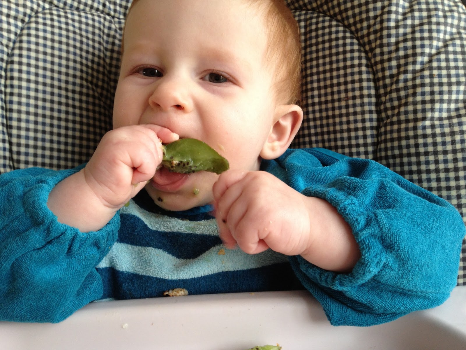 I posted a couple months ago about our first weeks with baby-led weaning (BLW). At that time Nate was not accepting spoon feeds, so we were going down the BLW route and he was just getting used to the idea of food, but not swallowing much of it.
